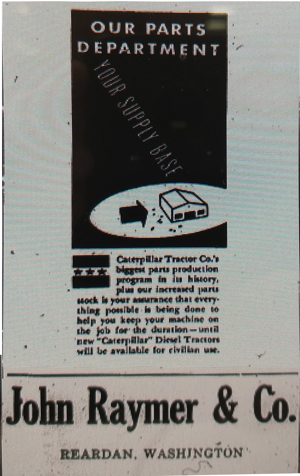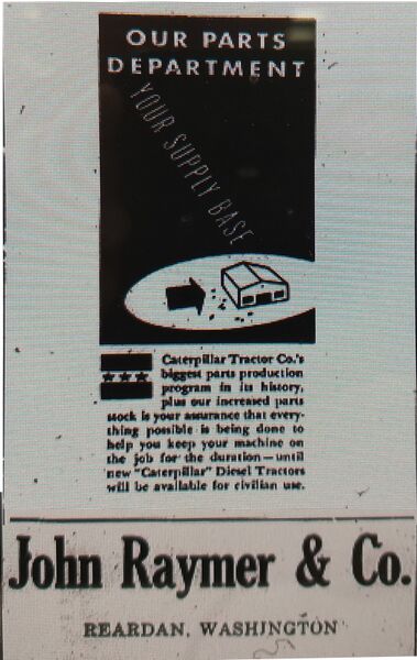 John Raymer and Co. ad for Catarpillar Tractor parts during the war from the Davenport Times-Tribune via WSU microfiche.