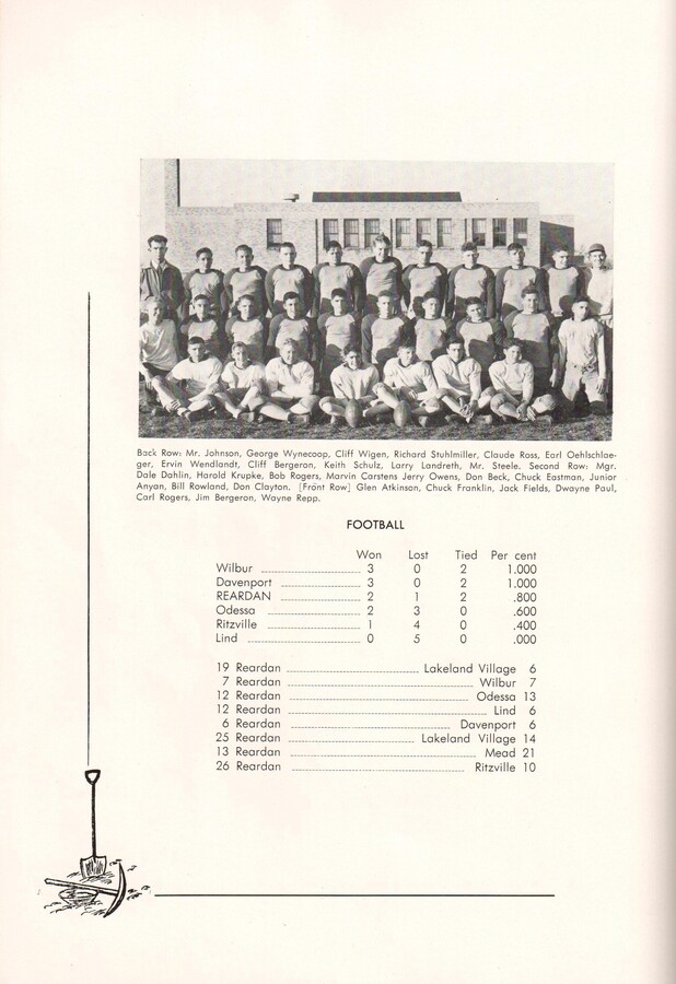 Back Row: Mr. Johnson, George Wynecoop, Cliff Wigen, Richard Stuhlmiller, Claude Ross, Earl Oehlschlaeger, Ervin Wendlandt, Cliff Bergeron, Keith Schulz, Larry Landreth, Mr. Steele. Second Row: Manager Dale Dahlin, Harold Krupke, Bob Rogers, Marvin Carstens Jerry Owens, Don Beck, Chuck Eastman, Junior Anyan, Bill Rowland, Don Clayton. Front Row: Glen Atkinson, Chuck Franklin, Jack Fields, Dwayne Paul Carl Rogers, Jim Bergeron, Wayne Repp.