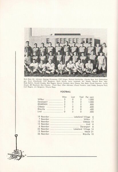 Davenport || 3 || 0 || 2 || 1.000 REARDAN || 2 || 1 || 2 || .800 Odessa || 2 || 3 || 0 || .600 Ritzville || 1 || 4 || 0 || .400 Lind || 0 || 5 || 0 || .000| Won | Lost | Tied | Percent | |