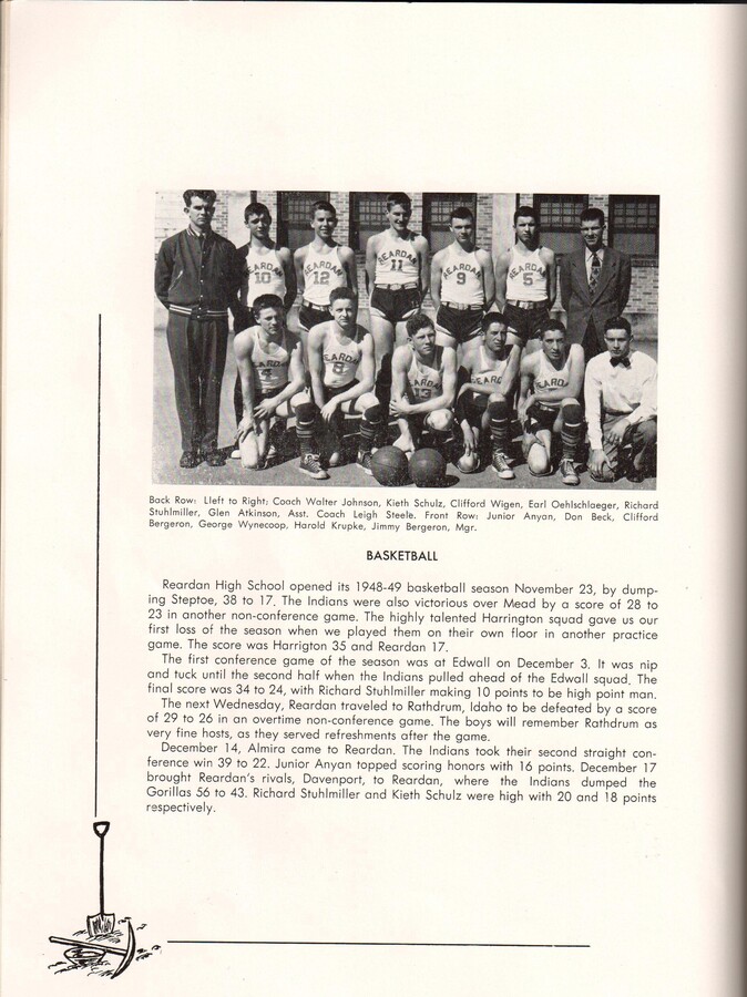 Reardan High School opened its 1948-49 basketball season November 23, by dumping Steptoe, 38 to 17, The Indians were also victorious over Mead by a score of 28 to 23 in another non-conference game. The highly talented Harrington squad gave us our first loss of the season when we played them on their own floor in another practice game. The score was Harrington 35 and Reardan 17.