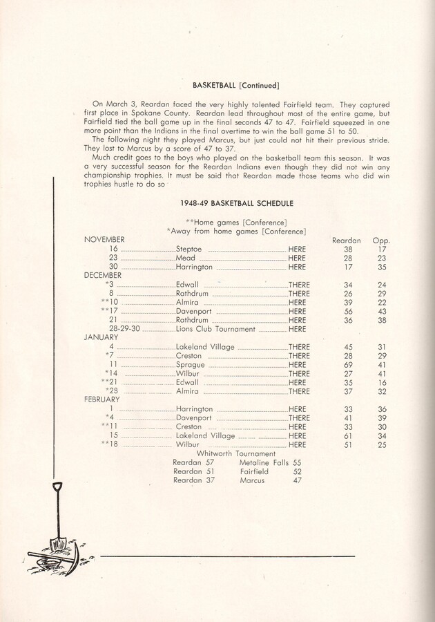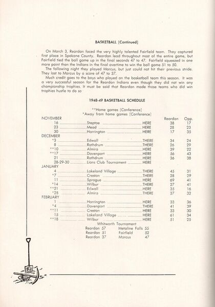 On March 3, Reardan faced the very highly talented Fairfield team. They captured first place in Spokane County. Reardan lead throughout most of the entire game, but Fairfield tied the ball game up in the final seconds 47 to 47. Fairfield squeezed in one more point than the Indians in the final overtime to win the ball game 51 to 50.