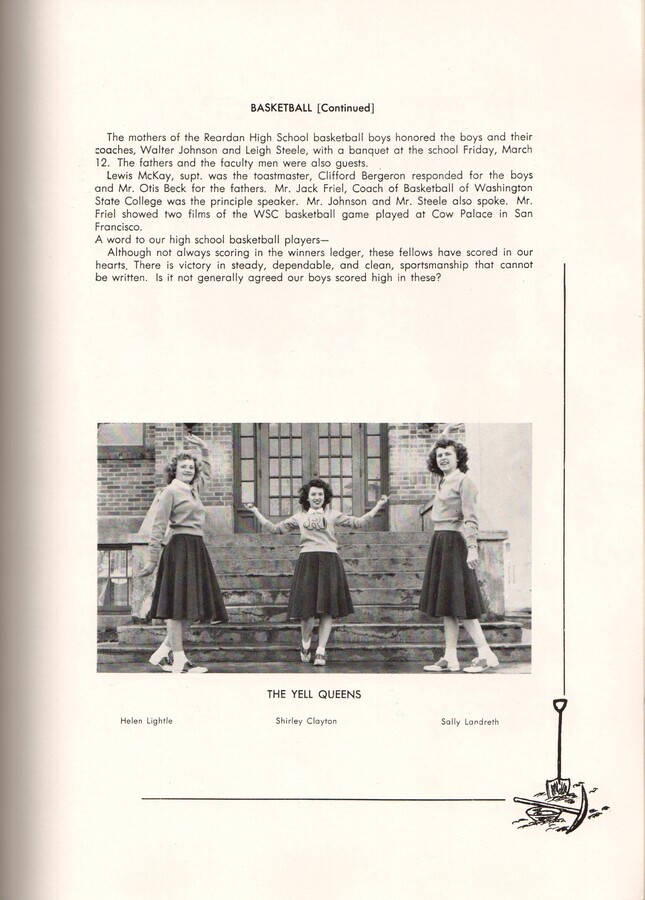 Lewis McKay, supt. was the toastmaster, Clifford Bergeron responded for the boys and Mr. Otis Beck for the fathers. Mr. Jack Friel, Coach of Basketball of Washington State College was the principle speaker. Mr. Johnson and Mr. Steele also spoke. Mr. Friel showed two films of the WSC basketball game played at Cow Palace in San Francisco.