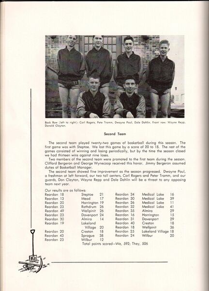 The second team showed fine improvement as the season progressed. Dwayne Paul, a freshman at left forward, our two tall centers, Carl Rogers and Peter Tramm, and our guards, Don Clayton, Wayne Repp and Dale Dahlin will be a threat to any opposing team next year.