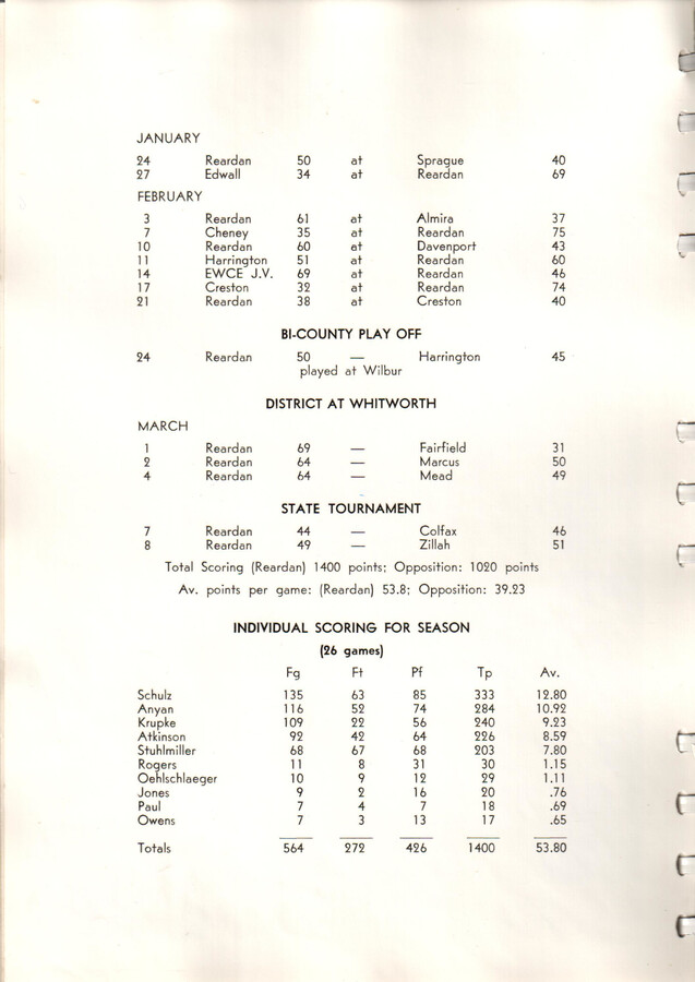 Total Scoring (Reardan) 1400 points; Opposition: 1020 points Av. points per game: (Reardan) 53.8; Opposition: 39.23