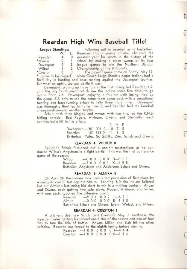 On April 28, the Indians took undisputed possession of first place by winning its crucial test against Almira. Leading, 6-0, the Indians faltered but cut Almira's last-inning bid short to win in a thrilling contest. Anyan and Owens, each getting two safe blows, Rogers, Atkinson, and Miller, with one each, supplied the offensive punch.