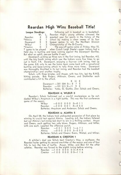 Schulz, with three singles, and Anyan, with two hits, led the R.H.S. hitting parade. Bob Rogers, Atkinson, Owens, and Stuhlmiller each contributed a hit to the attack.