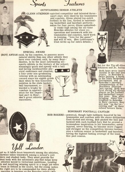 SPECIAL AWARD (ROY) ANYAN-said, by his coaches, to possess more natural ability than any other athlete they have ever coached; said, by many Reardanites, to be the most outstanding all-sports athlete in the history of the school; amazingly quick and speedy with a ball and having inexhaustible physical endurance and stamina; a four-year non-graduating veteran with an outstanding record since his eighth grade days when he won honorable mention in the state basketball tournament; awarded a trophy by coaches in appreciation for his important part in Reardan’s great athletic successes.