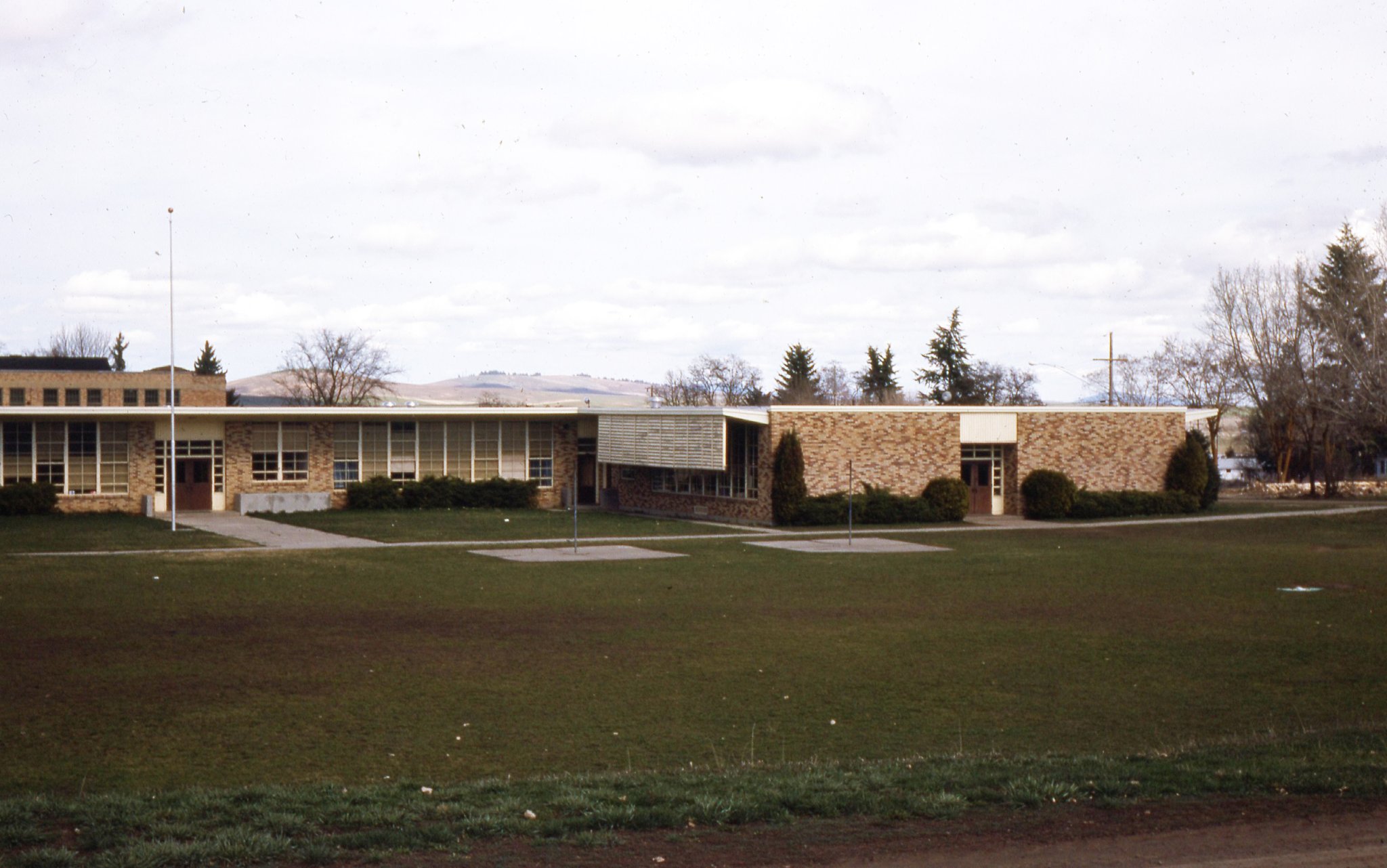 South side of 1952-1980 grade school and playground with 1955-1980 high school behind. (Photo by Jasper Kelso held by Nick Brommer.)(Photo by Jasper Kelso held by Nick Brommer.)
