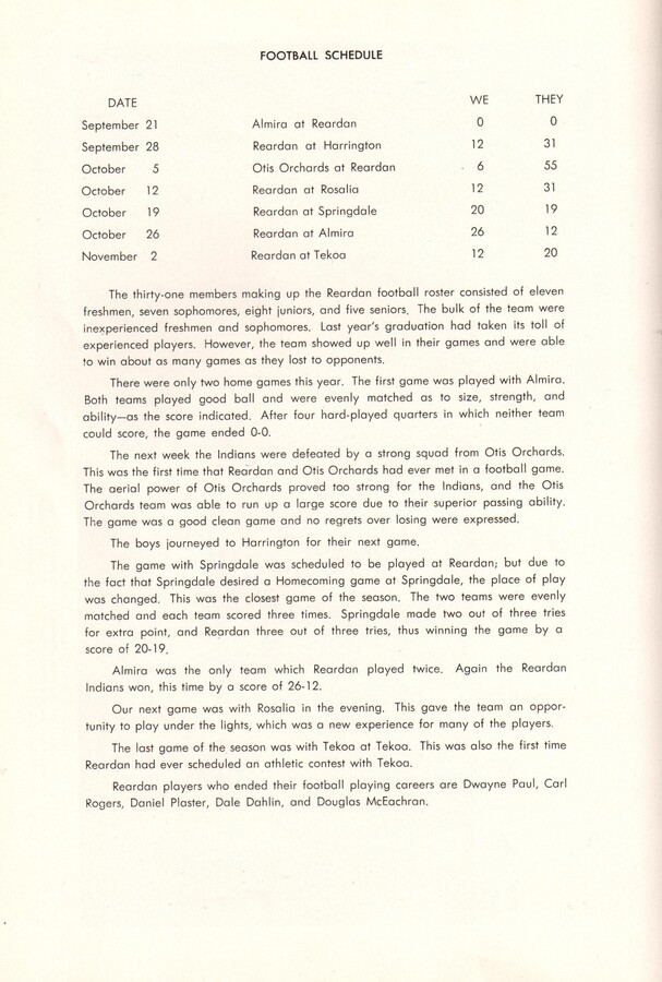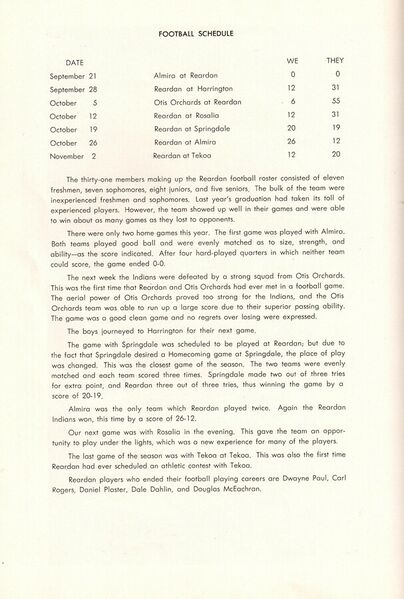 The next week the Indians were defeated by a strong squad from Otis Orchards. This was the first time that Reardan and Otis Orchards had ever met in a football game. The aerial power of Otis Orchards proved too strong for the Indians, and the Otis Orchards team was able to run up a large score due to their superior passing ability. The game was a good clean game and no regrets over losing were expressed.