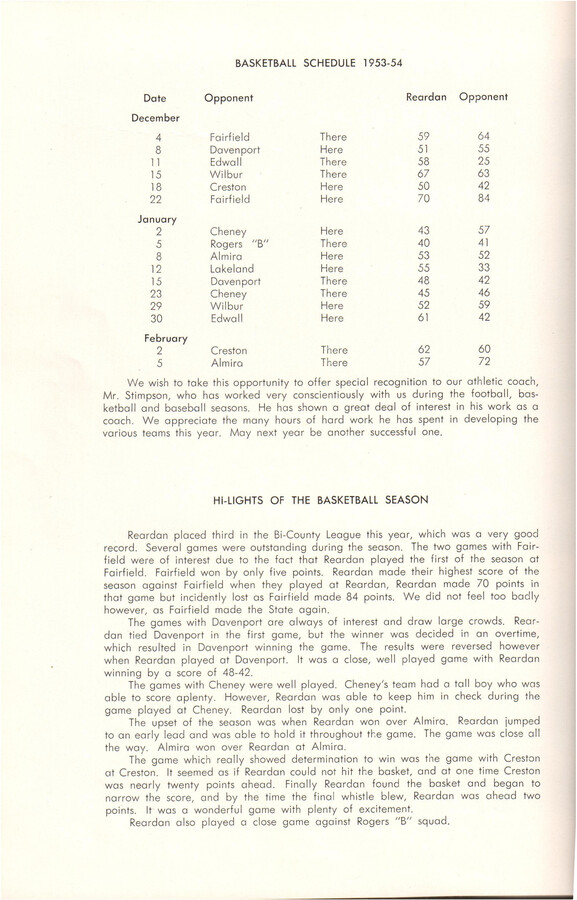 We wish to take this opportunity to offer special recognition to our athletic coach, Mr. Stimpson, who has worked very conscientiously with us during the football, basketball and baseball seasons. He has shown a great deal of interest in his work as a coach. We appreciate the many hours of hard work he has spent in developing the various teams this year. May next year be another successful one.