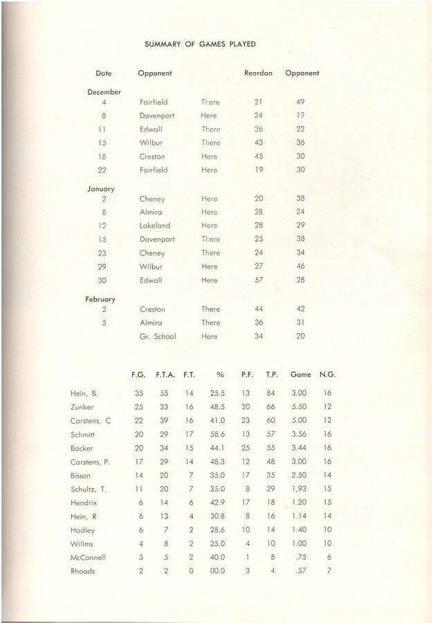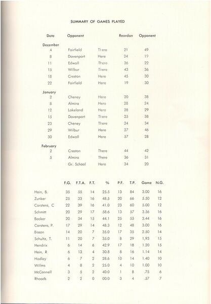 | Date | Opponent | Reardan | Opponent | December | 4 | Fairfield There | 21 | 49 | 8 | Davenport Here | 24 | 19 | la | Edwall There | 36 | 22 | LS | Wilbur There | 43 | 36 | 18 | Creston Here | 45 | 30 | 22 | Fairfield Here | 19 | 30 | January : | 2 | Cheney Here | 20 | 38 | 8 | Almira Here | 28 | 24 | 12 | Lakeland Here | 28 | 29 | 15 | Davenport There | 25 | 38 | 23 | Cheney There | 24 | 34 | 29 | Wilbur Here | 27 | 46 | 30 | Edwall Here | 57 | 28 | February | 2 | Creston There | 44 | 42 | 5 | Almira There | 36 | 31 | Gr. School Here | 34 | 20 |