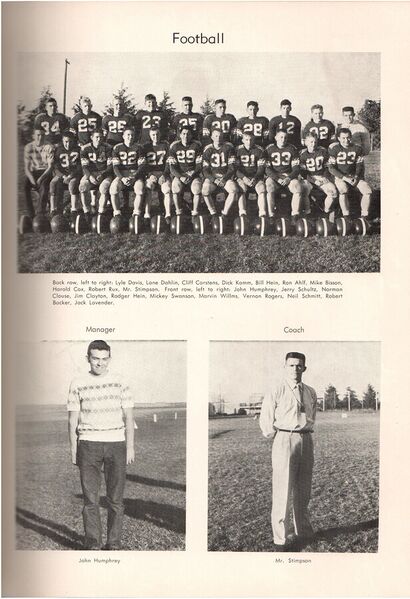 Back row, left to right: Lyle Davis, Lane Dahlin, Cliff Carstens, Dick Kamm, Bill Hein, Ron Ahlf, Mike Bisson, Harold Cox, Robert Rux, Mr. Stimpson. Front row, left to right: John Humphrey, Jerry Schultz, Norman Clouse, Jim Clayton, Rodger Hein, Mickey Swanson, Marvin Willms, Vernon Rogers, Neil Schmitt, Robert Backer, Jack Lavender.