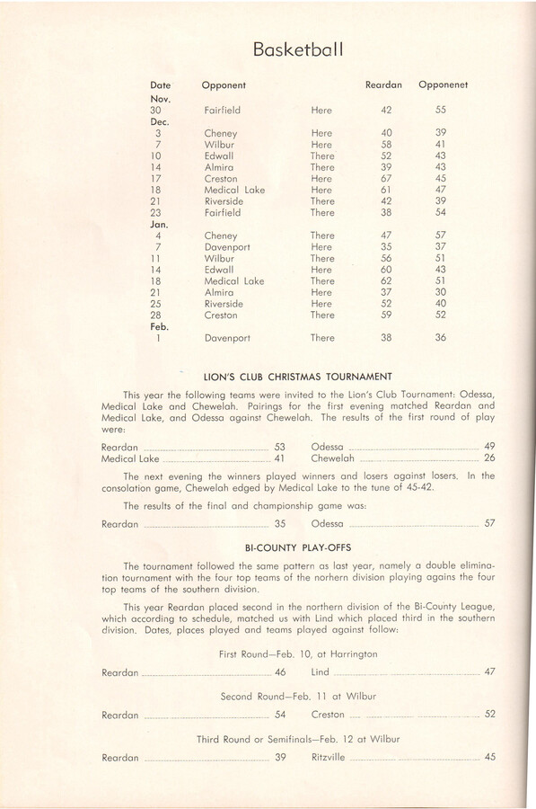 This year Reardan placed second in the northern division of the Bi-County League, which according to schedule, matched us with Lind which placed third in the southern division. Dates, places played and teams played against follow: