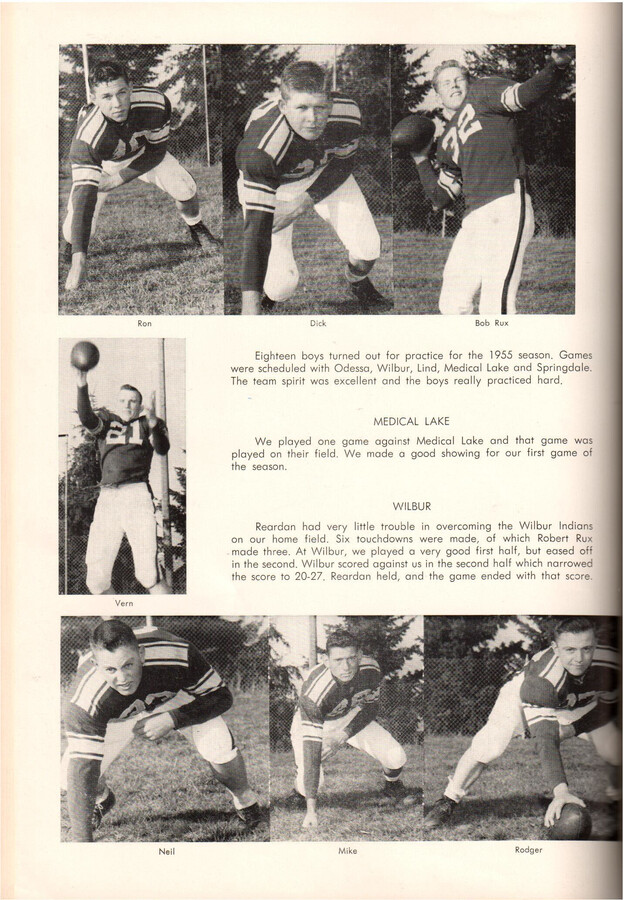 Reardan had very little trouble in overcoming the Wilbur Indians on our home field. Six touchdowns were made, of which Robert Rux made three. At Wilbur, we played a very good first half, but eased off in the second. Wilbur scored against us in the second half which narrowed the score to 20-27. Reardan held, and the game ended with that score.