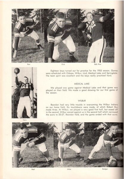 Eighteen boys turned out for practice for the 1955 season. Games were scheduled with Odessa, Wilbur, Lind, Medical Lake and Springdale. The team spirit was excellent and the boys really practiced hard,