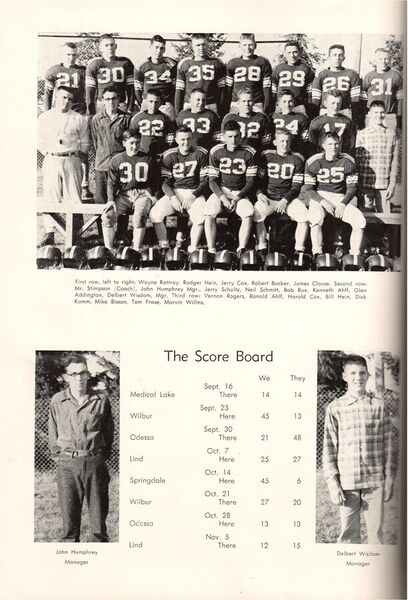 First row, left to right: Wayne Rattray, Rodger Hein, Jerry Cox, Robert Backer, James Clouse. Second row: Mr. Stimpson [Coach], John Humphrey Mgr., Jerry Schultz, Neil Schmitt, Bob Rux, Kenneth Ahlf, Glen Addington, Delbert Wisdom, Mgr. Third row: Vernon Rogers, Ronald Ahlf, Harold Cox, Bill Hein, Dick Kamm, Mike Bisson, Tom Frase, Marvin Willms,