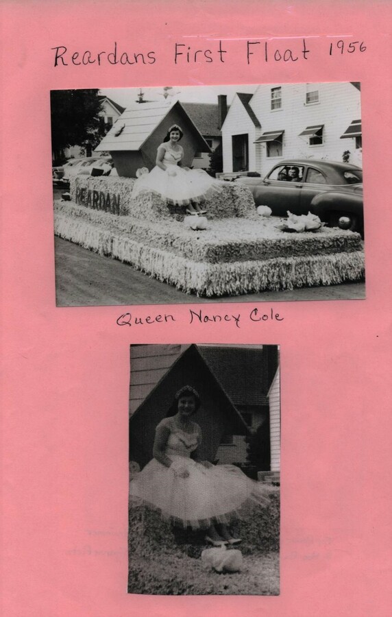 This page is from a scrapbook held by the Reardan Memorial Library about the Reardan Royalty. 1956 royalty 001