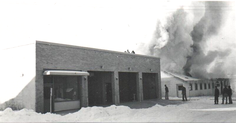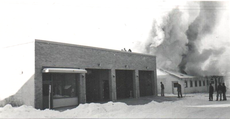 Fire station and burning Ranch House Restaurant 1957. (Held by the Reardan Memorial Library)