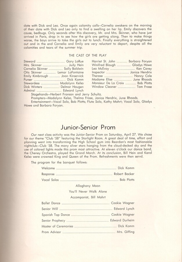 Our next class activity was the Junior-Senior Prom on Saturday, April 27. We chose for our theme “Club ‘58” featuring the Starlight Room. A great deal of time, effort and planning went into transforming the High School gym into Reardan’s most fashionable nightclub—Club ‘58, The many silver stars hanging from the cloud-decked sky and the use of colored lights made this prom most attractive. At eleven o’clock our dance band, the Cheney Orchestra, played the Grand March. At its conclusion, Bill Hein and Karol Kelso were crowned King and Queen of the Prom. Refreshments were then served.