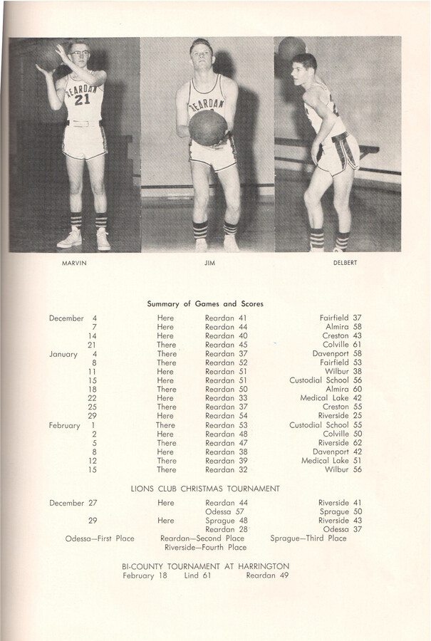 | Date | Where | We | Opponent | They | December 4 | Here | Reardan 41 | Fairfield | 37 | 7 | Here | Reardan 44 | Almira | 58 | 14 | Here | Reardan 40 | Creston | 43 | 21 | There | Reardan 45 | Colville | 61 | January 4 | There | Reardan 37 | Davenport | 58 | 8 | There | Reardan 52 | Fairfield | 53 | 11 | Here | Reardan 51 | Wilbur | 38 | 15 | Here | Reardan 51 | Custodial School | 56 | 18 | There | Reardan 50 | Almira | 60 | 22 | Here | Reardan 33 | Medical Lake | 42 | 25 | There | Reardan 37 | Creston | 55 | 29 | Here | Reardan 54 | Riverside | 25 | February 1 | There | Reardan 53 | Custodial School | 55 | 2 | Here | Reardan 48 | Colville | 50 | 5 | There | Reardan 47 | Riverside | 62 | 8 | Here | Reardan 38 | Davenport | 42 | 12 | There | Reardan 39 | Medical Lake | 51 | 15 | There | Reardan 32 | Wilbur | 56 |
