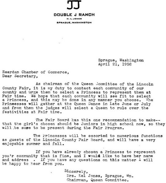 This page is from a scrapbook held by the Reardan Memorial Library about the Reardan Royalty. 1957 royalty 006