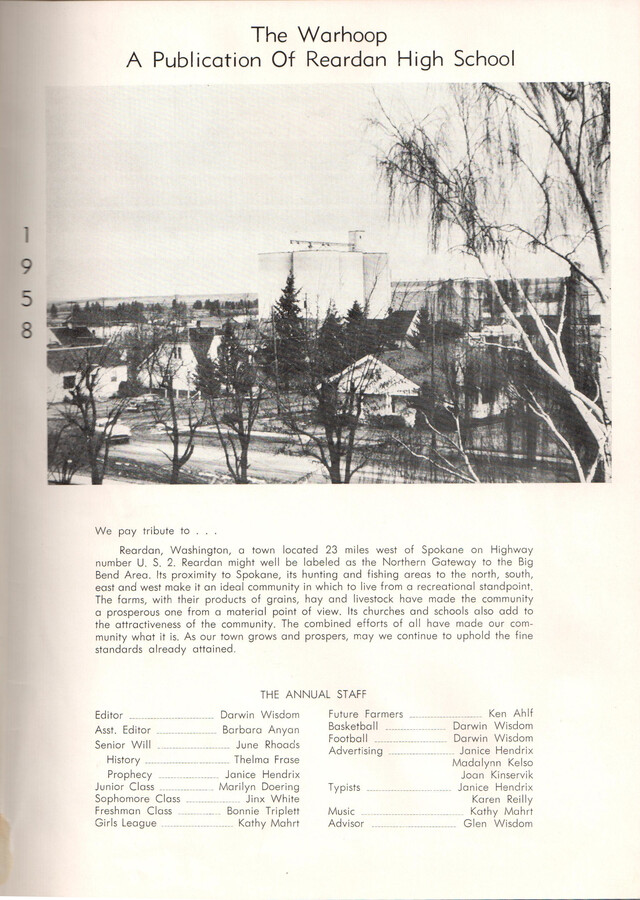 Reardan, Washington, a town located 23 miles west of Spokane on Highway number U. S. 2. Reardan might well be labeled as the Northern Gateway to the Big Bend Area. Its proximity to Spokane, its hunting and fishing areas to the north, south, east and west make it an ideal community in which to live from a recreational standpoint. The farms, with their products of grains, hay and livestock have made the community a prosperous one from a material point of view. Its churches and schools also add to the attractiveness of the community. The combined efforts of all have made our community what it is. As our town grows and prospers, may we continue to uphold the fine standards already attained.