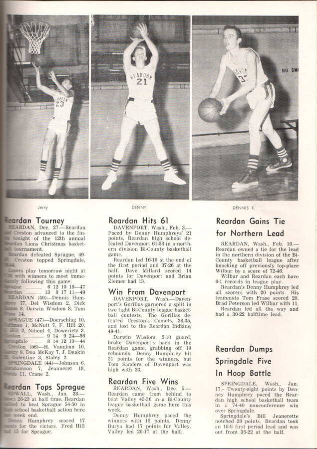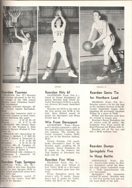 Reardan’s Denny Humphrey led all scorers with 20 points. His teammate Tom Frase scored 20. Brad Peterson led Wilbur with 11.
