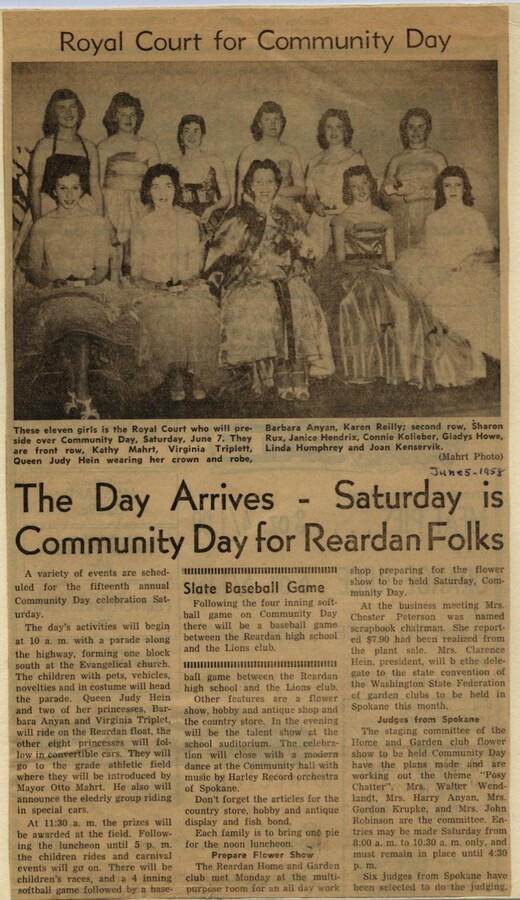 This page is from a scrapbook held by the Reardan Memorial Library about the Reardan Royalty. 1958 royalty 002
