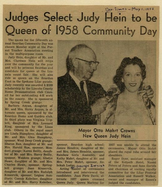 This page is from a scrapbook held by the Reardan Memorial Library about the Reardan Royalty. 1958 royalty 003