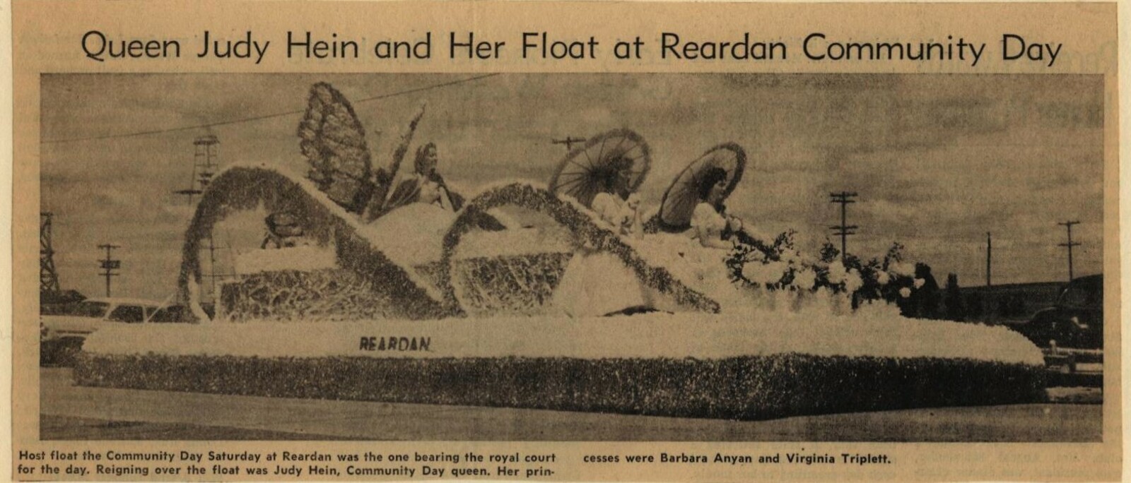 This page is from a scrapbook held by the Reardan Memorial Library about the Reardan Royalty. 1958 royalty 004