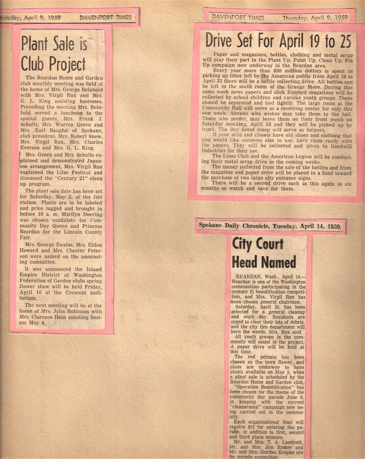Plant sale, recycling pickup drive. Part of the Beautification Scrapbooks held by Reardan Memorial Library.