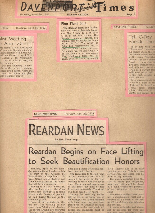 Progress on beautification project. Part of the Beautification Scrapbooks held by Reardan Memorial Library.
