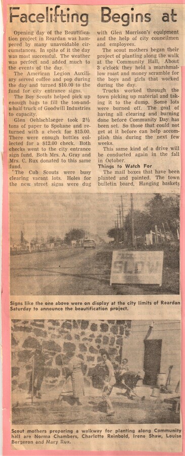 Facelift begins. Part of the Beautification Scrapbooks held by Reardan Memorial Library.