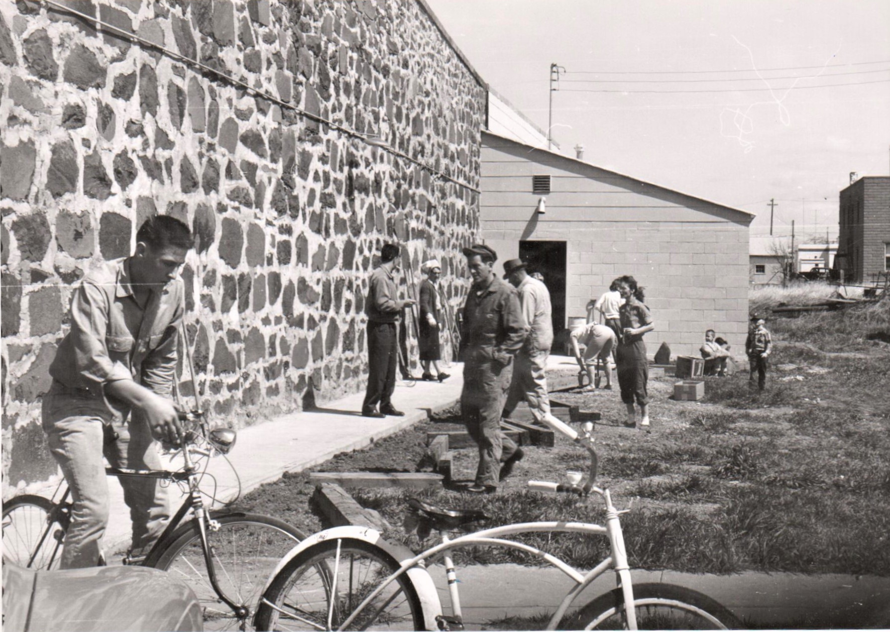 Boy Scouts setting curbs at Community Hall. Photograph scraped from the Beautification Scrapbooks held by Reardan Memorial Library.