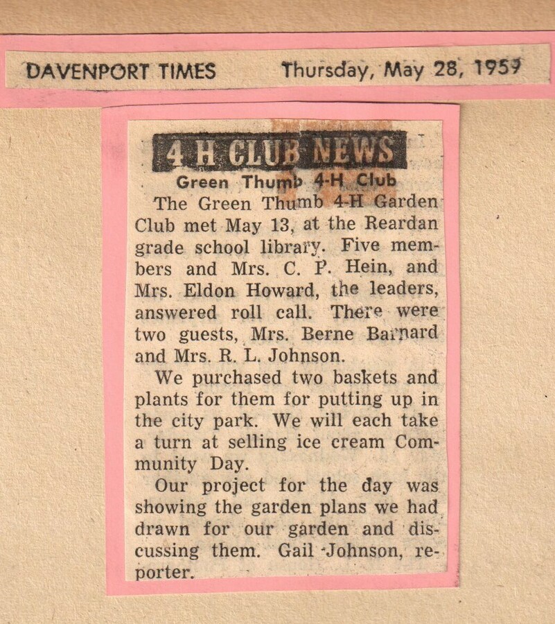 Davenport Times article about Green Thumbs 4-H club. Part of the Beautification Scrapbooks held by Reardan Memorial Library.