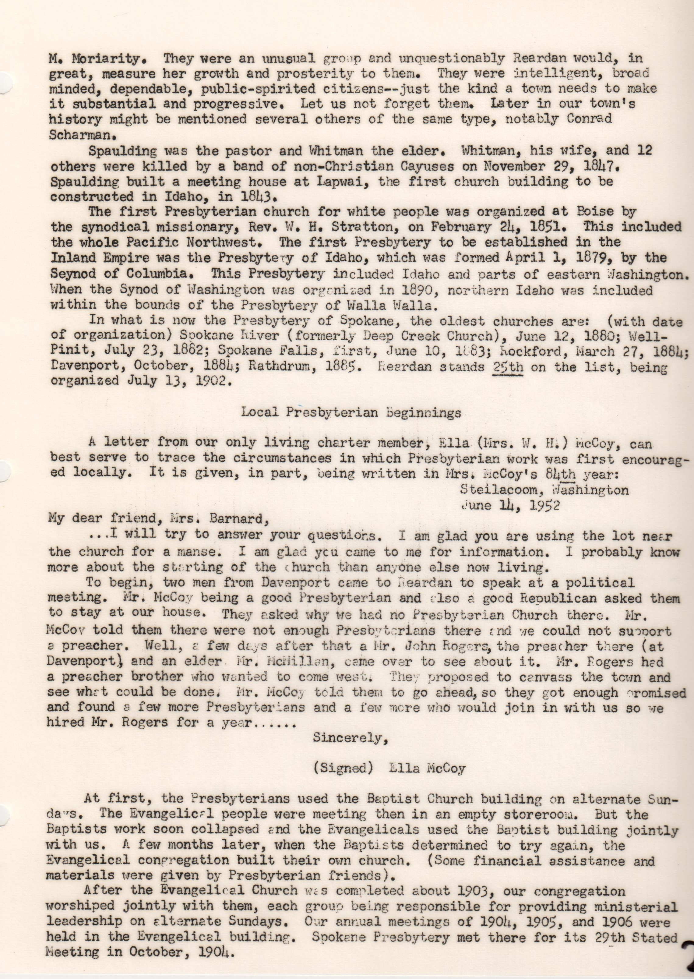 Part of the Early History of Reardan by the 1959 Reardan Washington State History class