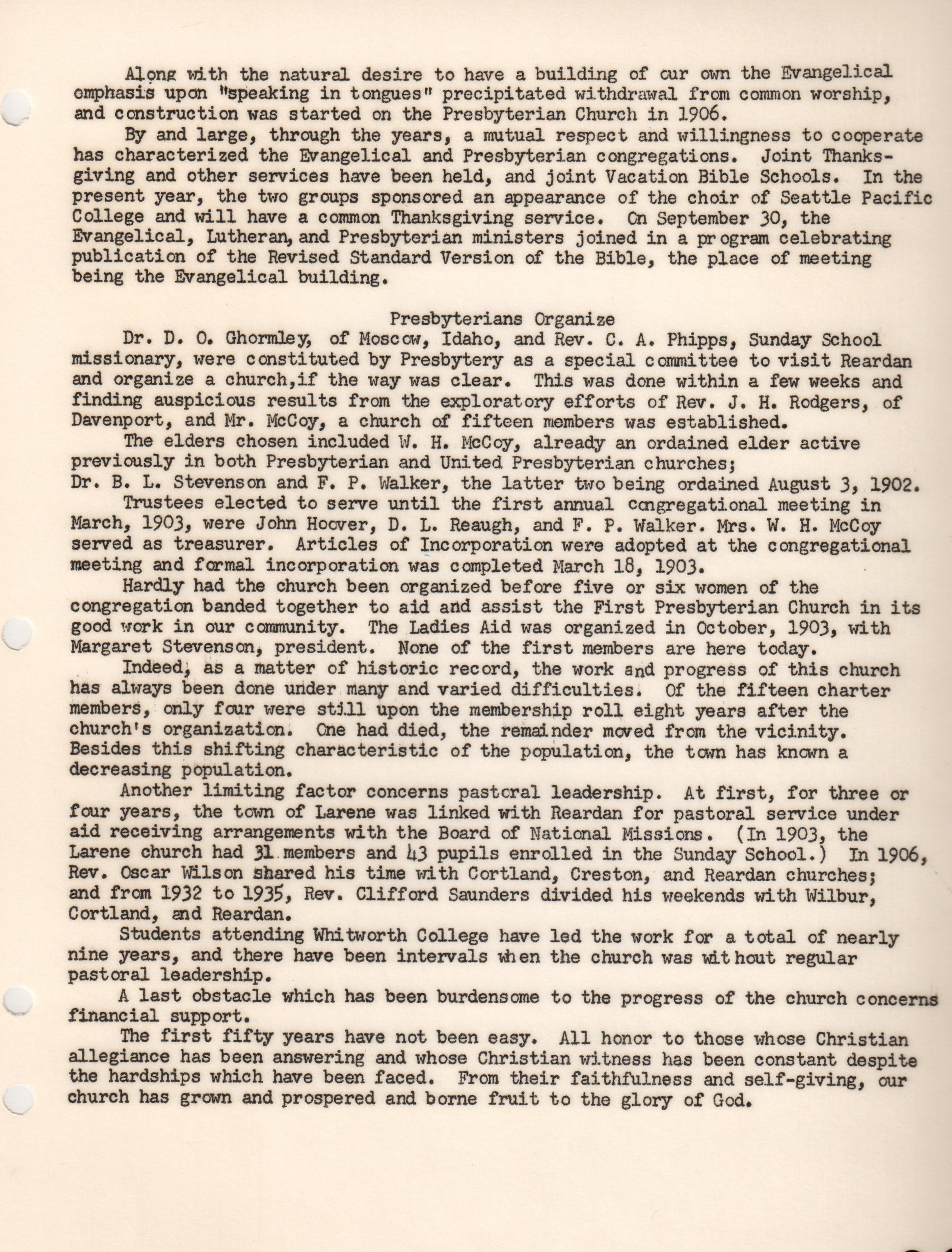 Part of the Early History of Reardan by the 1959 Reardan Washington State History class