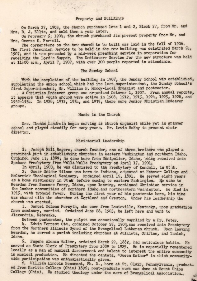 Part of the Early History of Reardan by the 1959 Reardan Washington State History class