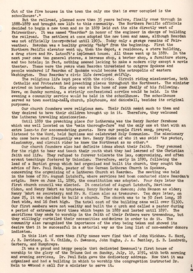 Part of the Early History of Reardan by the 1959 Reardan Washington State History class