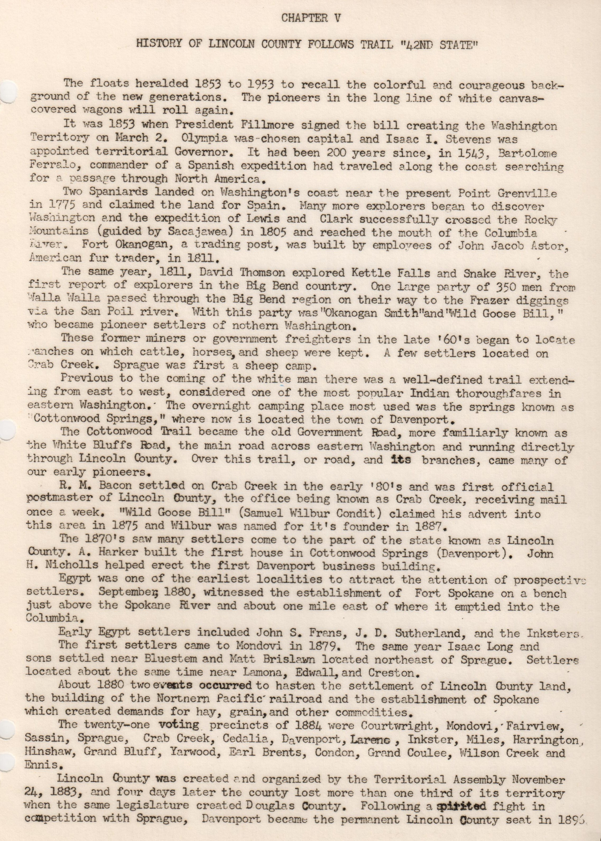 Part of the Early History of Reardan by the 1959 Reardan Washington State History class