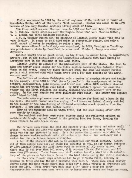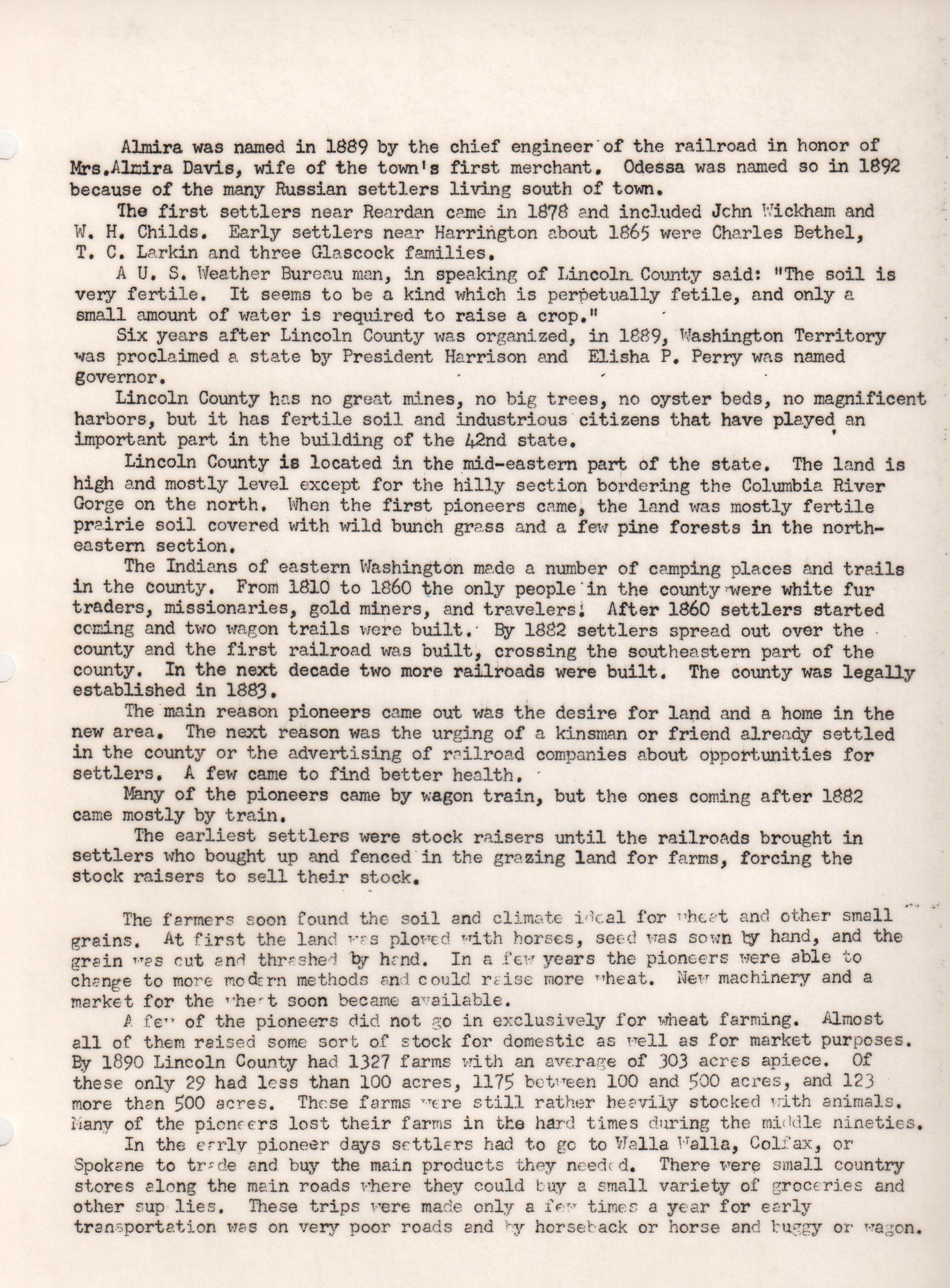 Part of the Early History of Reardan by the 1959 Reardan Washington State History class