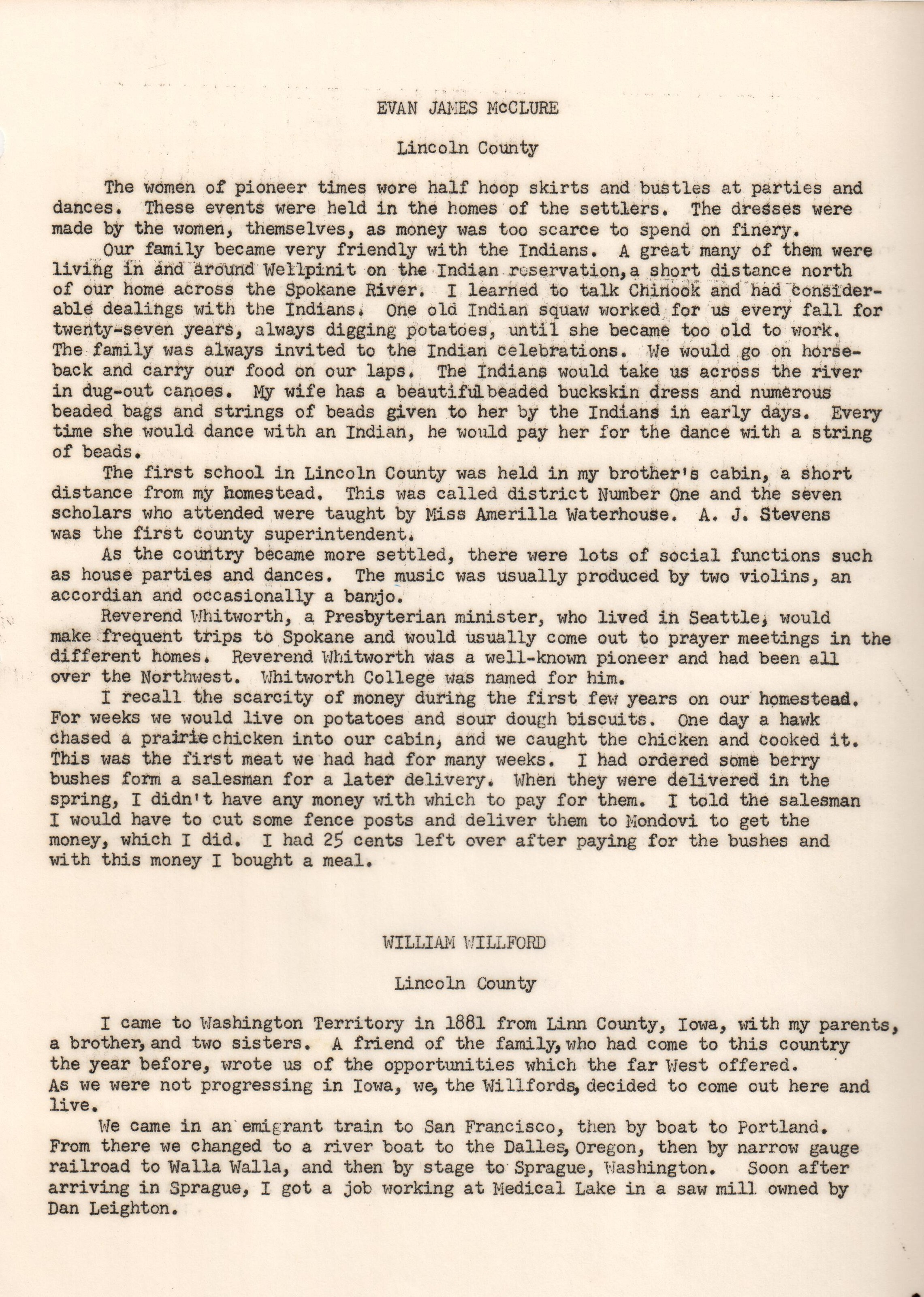 Part of the Early History of Reardan by the 1959 Reardan Washington State History class