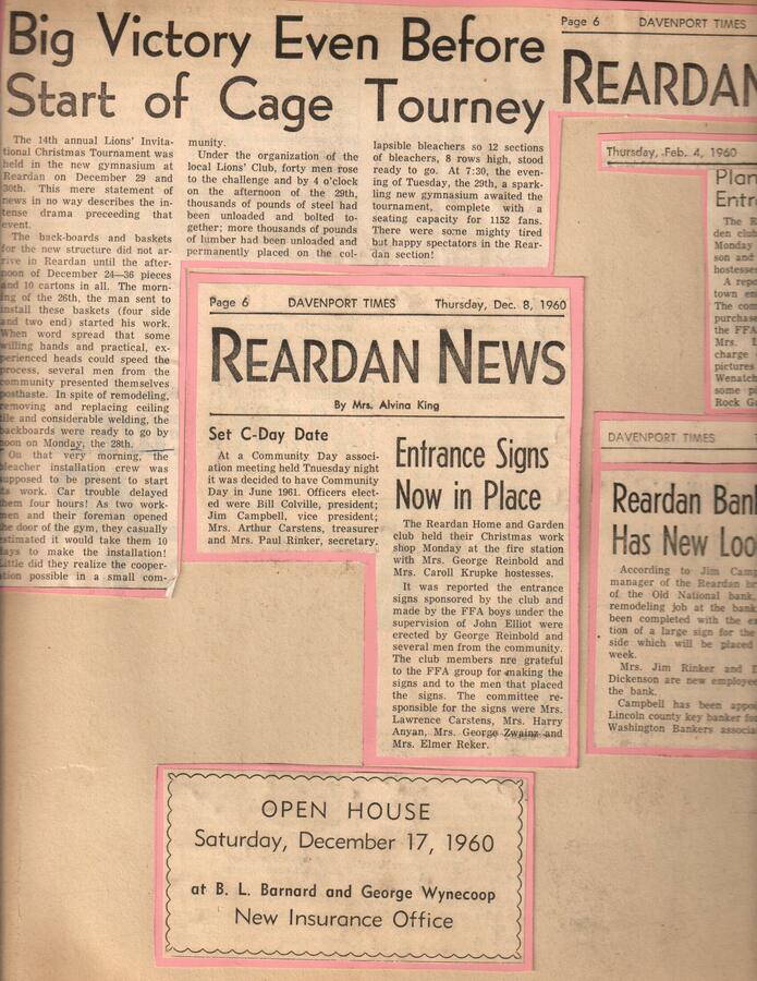 Davenport Times articles about basketball, new entrance signs. Part of the Beautification Scrapbooks held by Reardan Memorial Library.