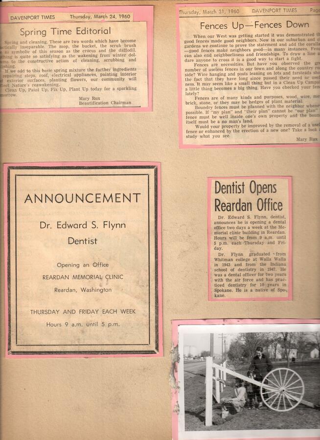 Davenport Times articles about spring clean up, Dr. Flynn dentist, photo west entrance. Part of the Beautification Scrapbooks held by Reardan Memorial Library.
