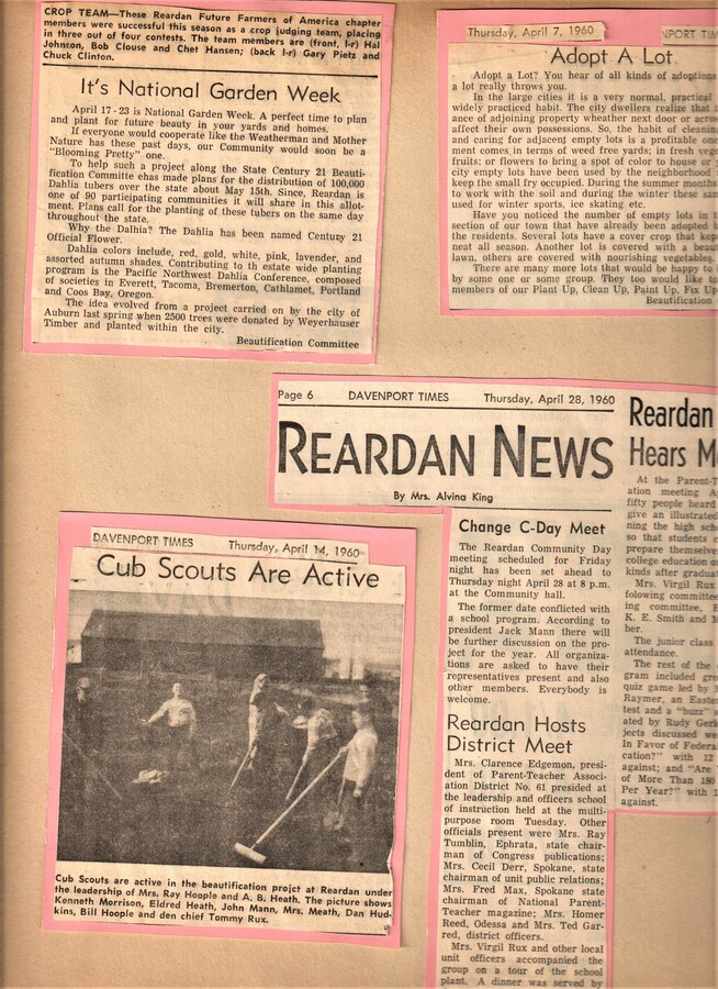 Davenport Times articles about spring cleanup. Part of the Beautification Scrapbooks held by Reardan Memorial Library.