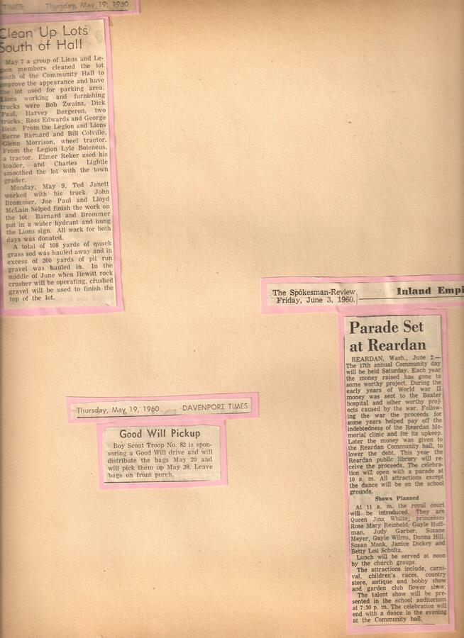 Newspaper articles about cleanup, Good Will pickup and Community Day parade. Part of the Beautification Scrapbooks held by Reardan Memorial Library.