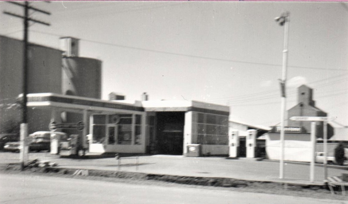 Union 76 Station on northwest corner of Broadway Avenue and Aspen Street. Appears to have been taken when Broadway (US 2) was under construction in 1960. Some elevators are visible. Also photo of two trucks hauling wood between 1920 and 1940 on the Crescent grade north of Reardan. (Held by the Reardan Memorial Library)