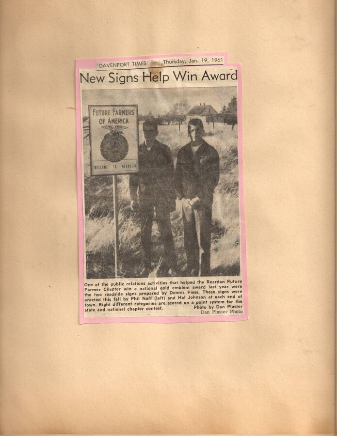Davenport Times photo of FFA installing FFA signs in Reardan. Part of the Beautification Scrapbooks held by Reardan Memorial Library.