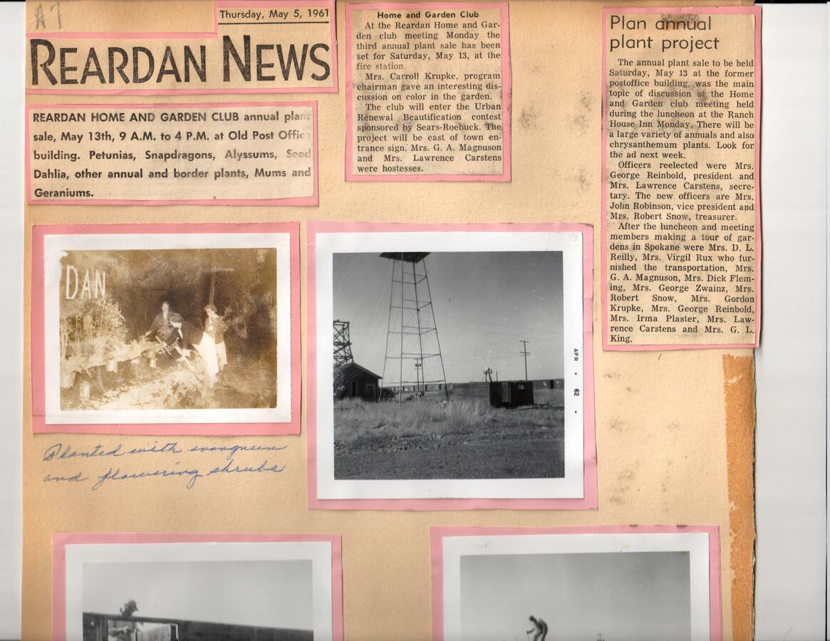 Photo graph of jail and water tower and Davenport Times article about Garden Club. Part of the Beautification Scrapbooks held by Reardan Memorial Library.