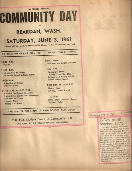 Community Day flyer. Part of the Beautification Scrapbooks held by Reardan Memorial Library.